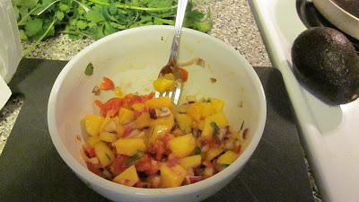 Anywho, i'm not a fan of fish ,I know i've probably mentioned this a million times. I want to like it so badly so I have more options. I actually like sushi much better than cooked fish, maybe its the rice, soy sauce, and saki that usually go along with it. I am well aware of the nutritional benefits of fish so i'm trying to find ways that I actually enjoy eating it, instead of trying to force down that wierd textured meat. I found this recipe for Tilapia "Tacos" and Peach Salsa( which I changed to Mango, when I couldn't find a peach anywhere in Whole Foods) in my new book! I really liked this recipe, the cilantro and sweetness from the salsa really complimented the Tilapia well.